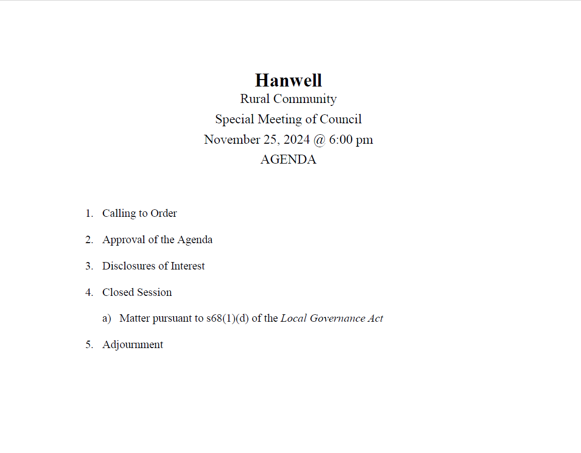 For anyone who would like to view the Agenda for the Special Meeting of Council, Monday, November 25th, 2024, at 6:00 pm, please see attached: