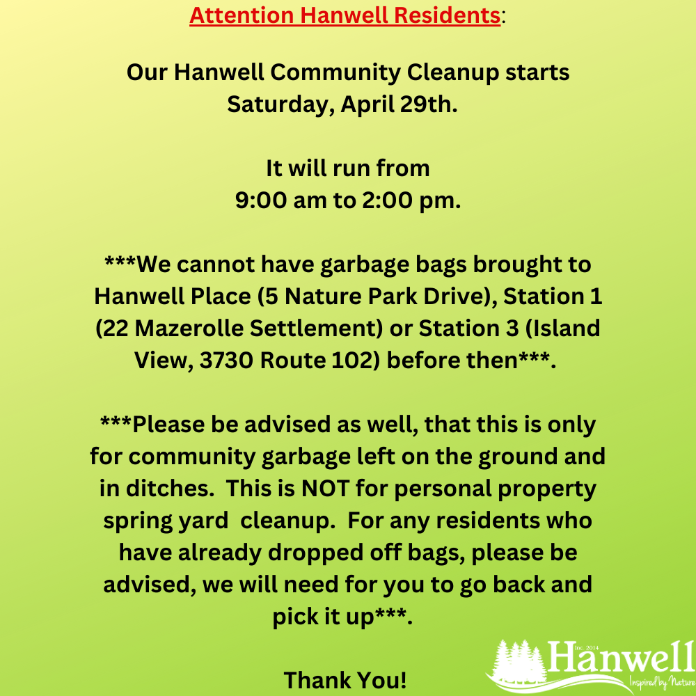 ATTENTION: Hanwell Cleanup Starts Saturday, April 29th. 9:00 am – 2:00 pm.
