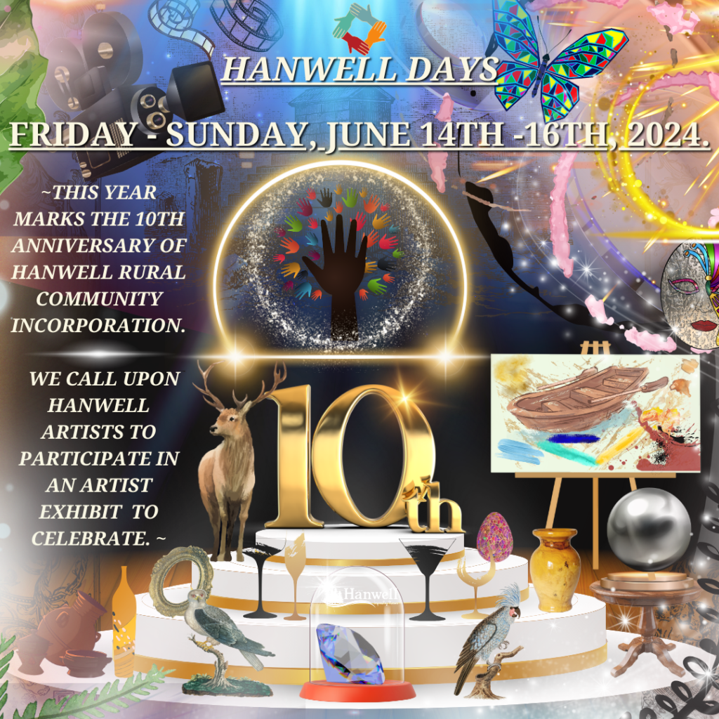 As we prepare for Hanwell Days, Friday – Sunday, June 14th – June 16th, 2024, we are proud and excited to celebrate what marks the 10th year anniversary of Hanwell Rural Community incorporation! We are now calling for Hanwell artists to participate in an artist exhibit!
