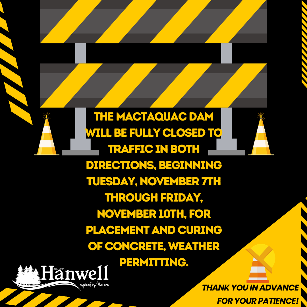 Mactaquac Dam Closed – Tuesday, November 7th – Friday, November 10th, 2023.