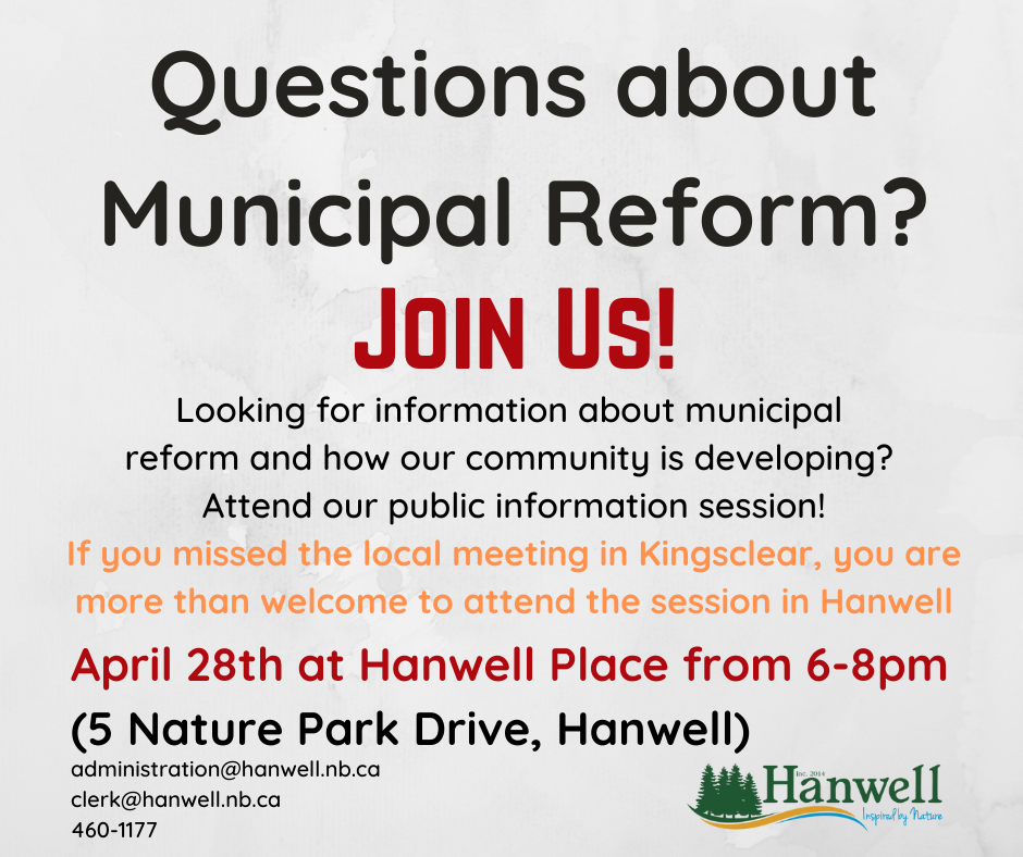 Join us at Hanwell Place on 28th from 6-8pm to learn about municipal reform and our community!
